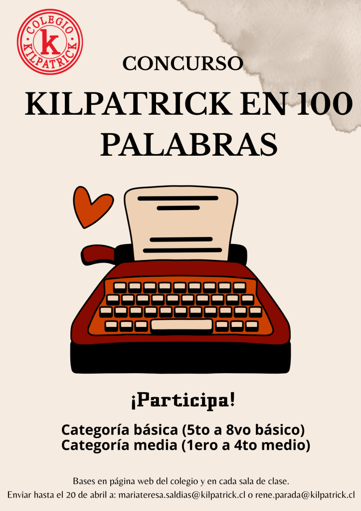 - Concurso “Kilpatrick en 100 Palabras”. La premiación se realizará el 23 de abril. (Para mayor información puede escribir a: rene.parada@kilpatrick.cl o mariateresa.saldias@kilpatrick.cl. (Ver BASES DEL CONCURSO)