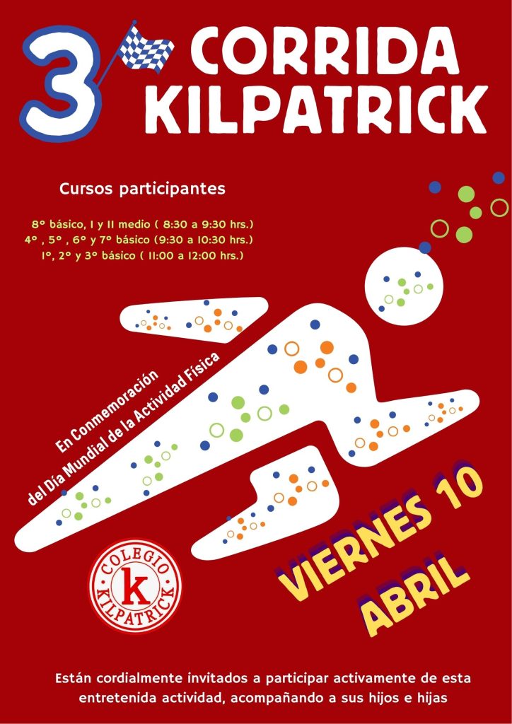 - Corrida Kilpatrick, que se llevará a cabo el viernes 10 de abril. Participarán estudiantes desde 1° básico hasta 2° medio. Los padres y apoderados están cordialmente invitados a acompañar a sus hijos.